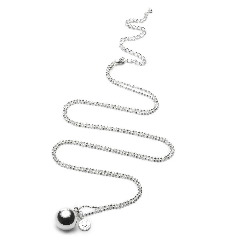 Cette jolie bola de grossesse Ballchain plaquée argent de la marque Proud Mama est montée sur une longue chaîne en argent de 120cm.