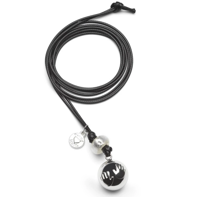 Cette jolie bola de grossesse argenté de la marque Proud Mama est décorée par deux petites empreintes de mains, trop craquant ! Elle est montée sur un long cordon noir de 120cm.