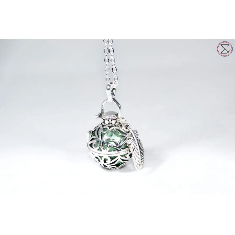 Cette jolie bola de grossesse 100% plaquée argent de la marque Irréversible Bijoux est composée d’une jolie cage argentée avec une boule carillon vert d’eau et une petite plume. Elle est montée sur une longue chaine en acier inoxydable de 114cm