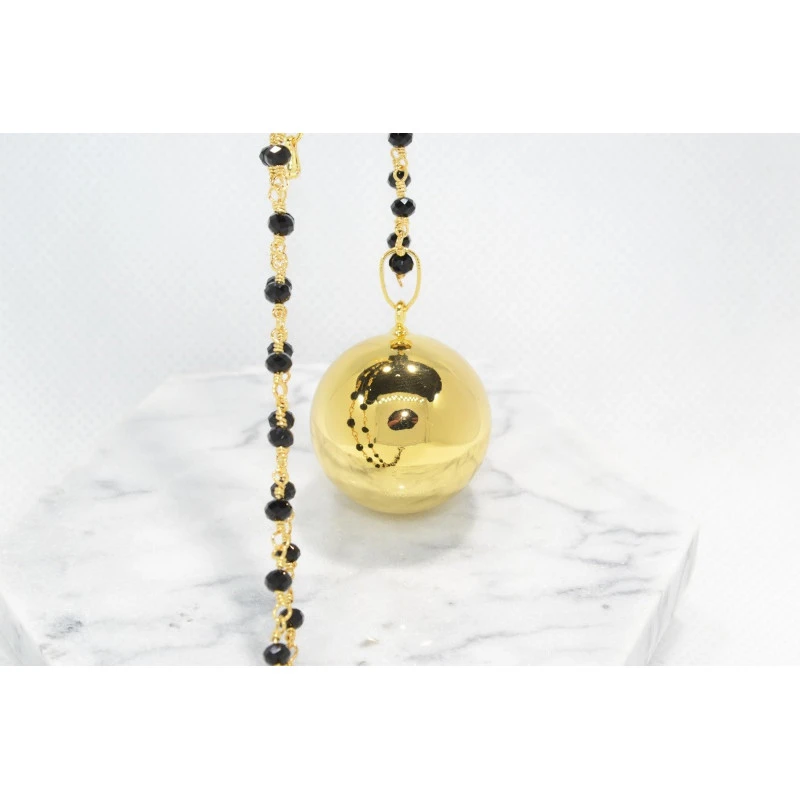Ce beau bola de grossesse plaqué or de la marque Irréversible est monté sur une longue chaßne de 114 cm, vous serez séduite par sa belle chaine perlée de cristal de roche noir !