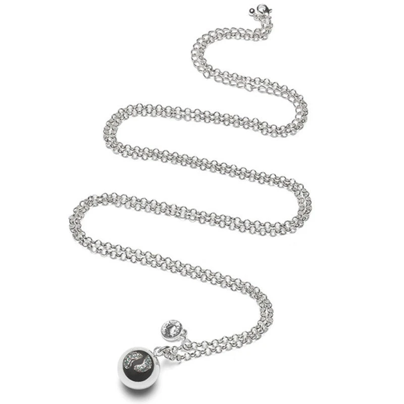 Cette jolie bola de grossesse argenté de la marque Proud Mama est décorée par deux petites empreintes de pieds en strass bleu, trop craquant ! Elle est montée sur une longue chaîne de 120cm.