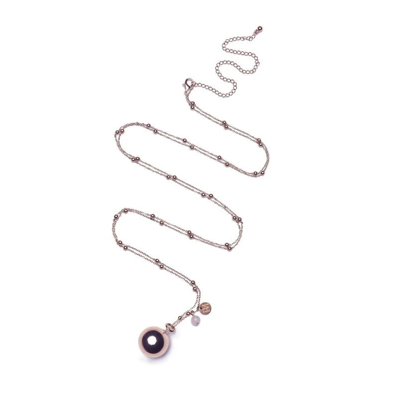 Cette jolie bola de grossesse dorée de la marque Proud Mama est montée sur une longue chaîne de 120cm avec de jolies petites perles et d’une petite perle rose.