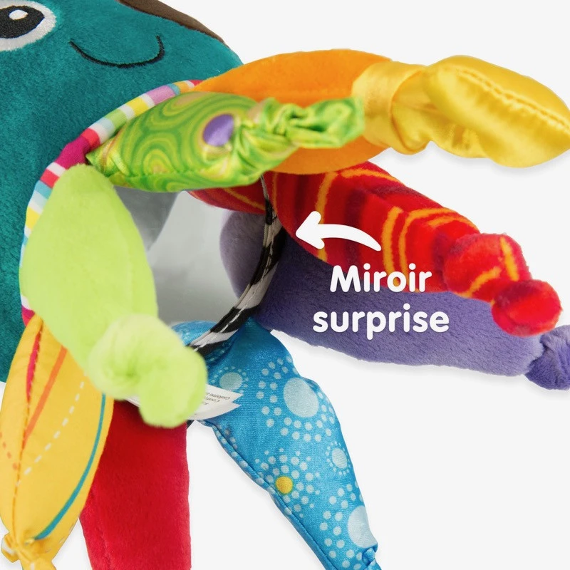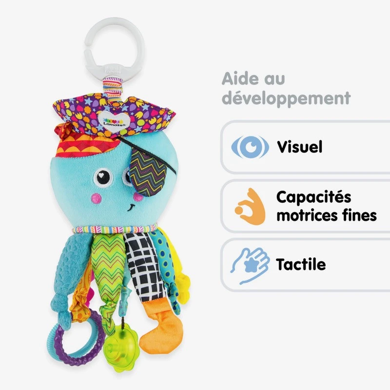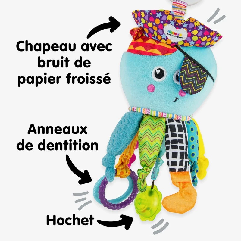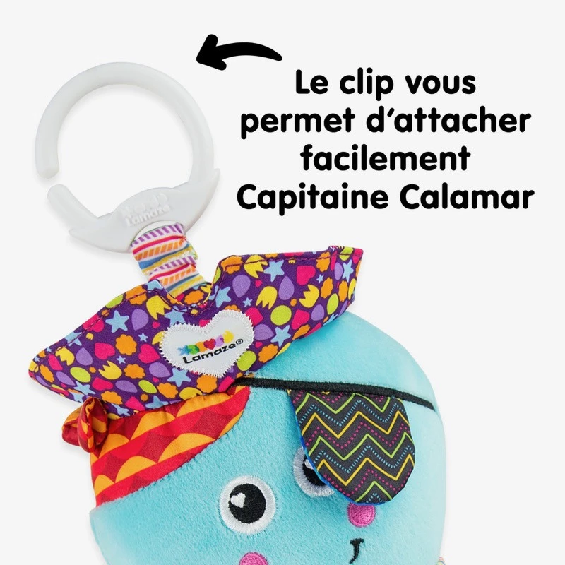 Le jouet d’activités Capitaine Calamar Lamaze est un vrai pirate ! Il recèle de surprises à découvrir, un miroir caché ou un chapeau bruissant par exemple, ainsi que de fins détails comme la plume sur le couvre-chef, pour entrainer bébé aux gestes les plus précis.