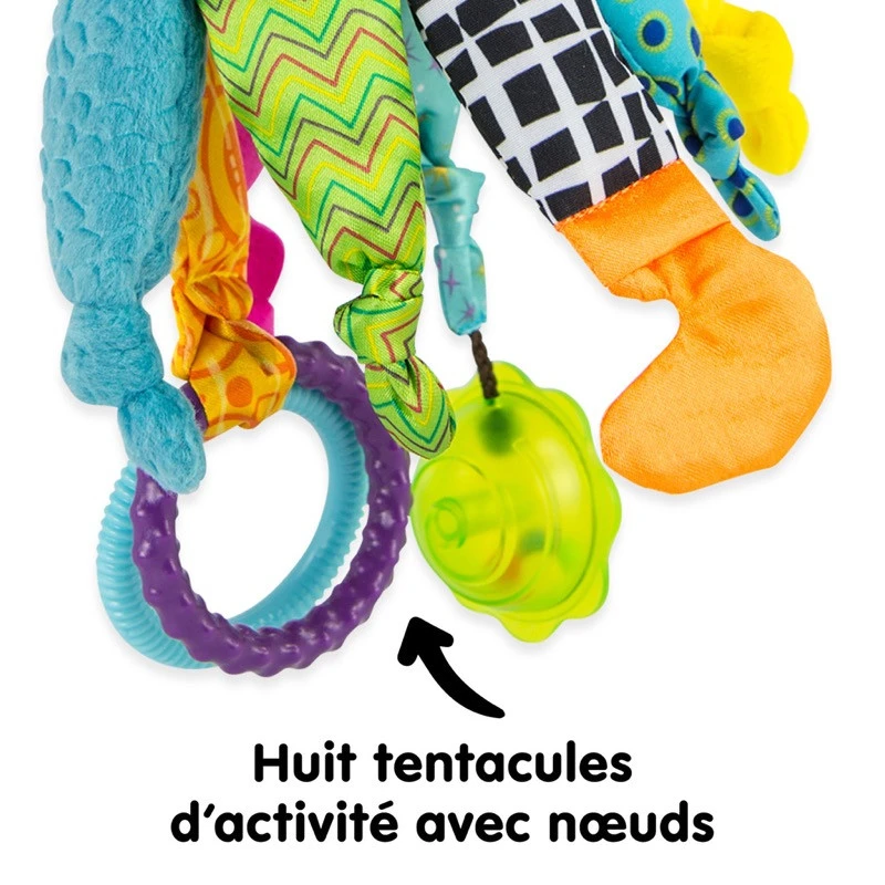 Comme tout calamar qui se respecte, le jouet d’activités Capitaine Calamar Lamaze dispose de 8 tentacules, aux couleurs, motifs et matières variés, qui se terminent par des petits nœuds ou des jeux, tels que des anneaux à mordiller ou une boule à billes colorées.