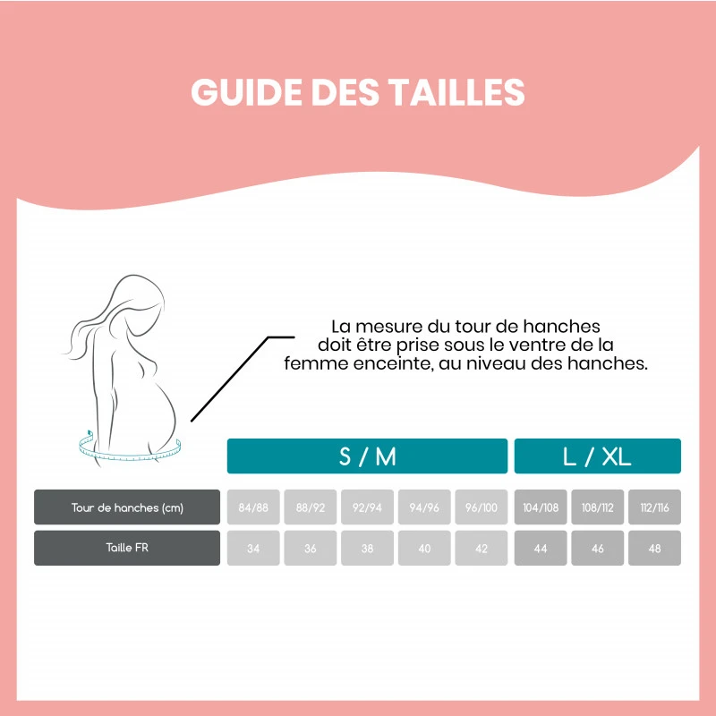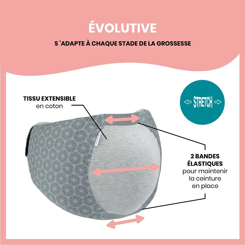 - Tissu extensible pour s’adapter à chaque stade de la grossesse.