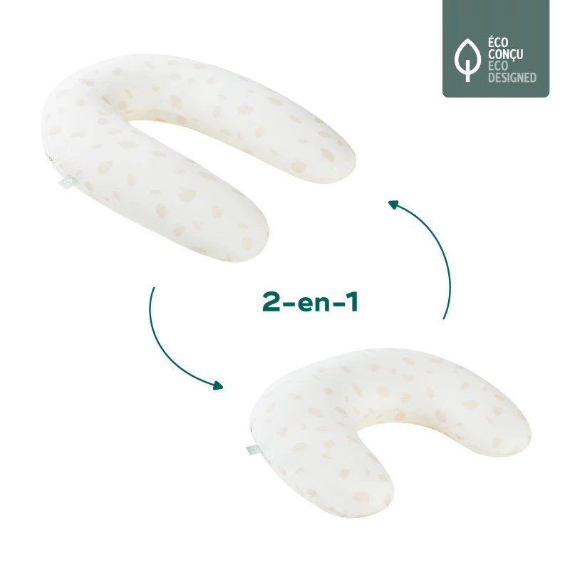Tout d’abord coussin de maternité, long et très douillet, il est parfait pendant la grossesse afin de soutenir votre dos, vos jambes et votre ventre. Par la suite, il devient un coussin compact très pratique pour allaiter ou donner le biberon à votre bébé à la bonne hauteur ou pour vous apporter plus de confort dans les transports ou sur votre canapé.