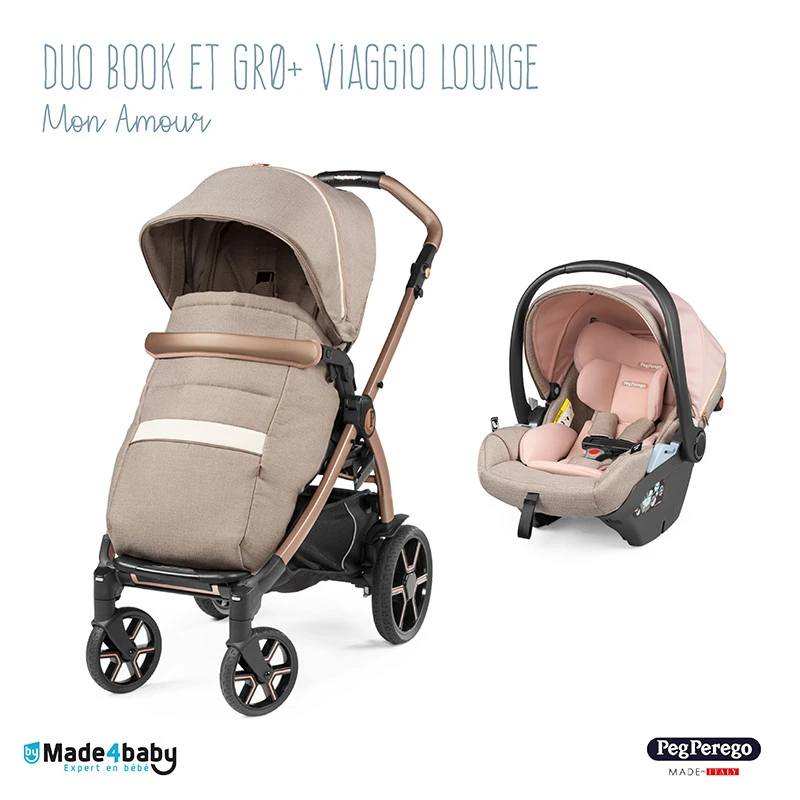 Le Pack Duo Book Modular & Gr0+ Lounge Peg Perego « Mon amour » se compose de la poussette avec son assise réversible, sa grande capote, son couvre jambe matelassé et son sac à langer coordonné, ainsi que du siège auto 1er âge Primo Viaggio Lounge.