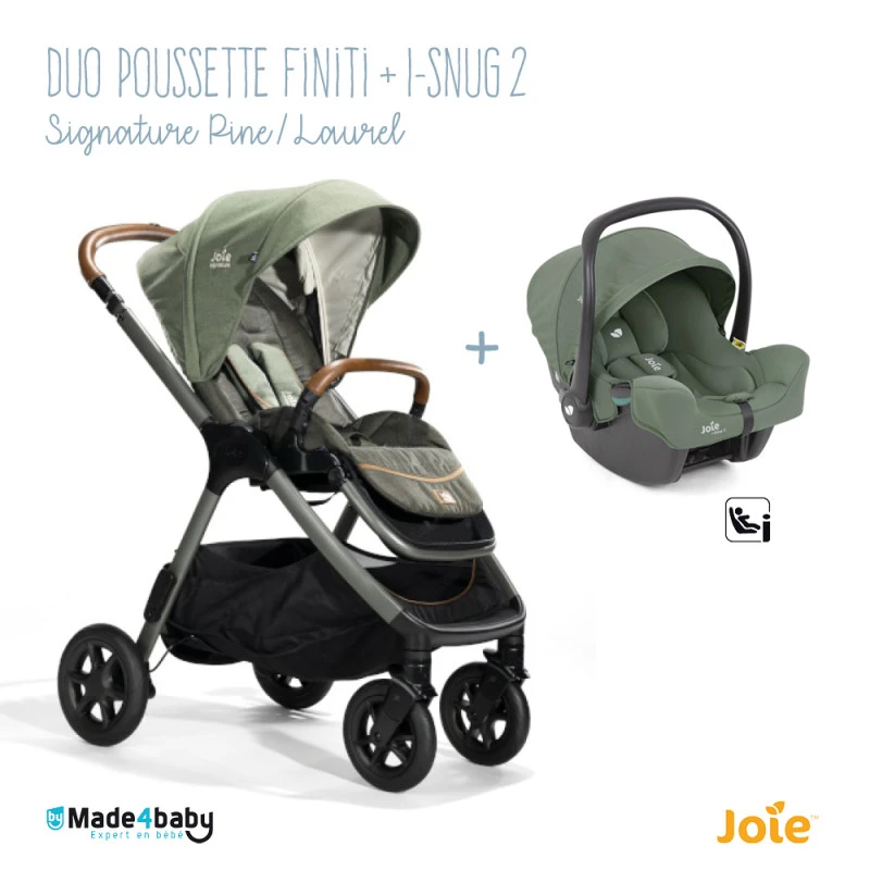 Pour ce Duo composé par Joie, la poussette est accompagnée du siège auto i-Snug 2 qui répond aux exigences de sécurité les plus élevées imposées par la norme R129/03. Il appartient à la gamme modulaire Encore Spinning System, homologuée i-Size : une seule et même base pivotante, la i-Base Encore qui accueille successivement la « coque » i-Snug 2 jusqu’à 12 mois environ, puis le siège-auto i-Harbour jusqu’à 4 ans environ. (Base et sièges vendus séparément)