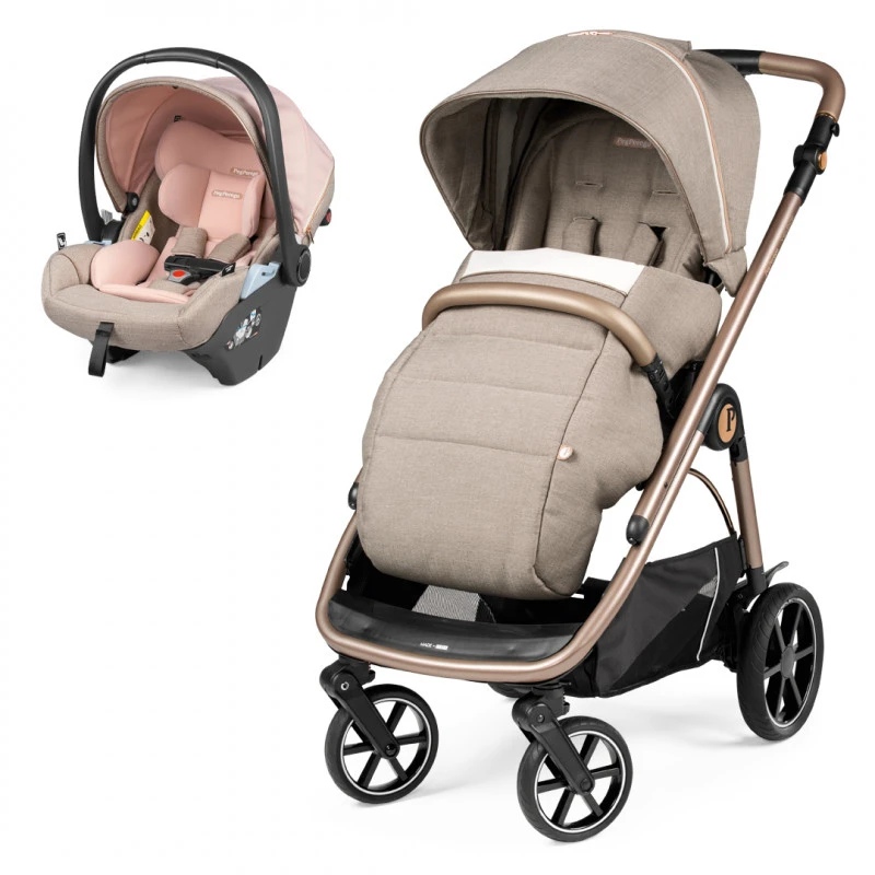 Le Pack duo Veloce avec son Primo Viaggio Lounge Peg Perego se compose de la poussette avec son assise réversible, sa grande capote et son couvre jambe coordonné, accompagné du siège auto 1er âge Primo Viaggio Lounge.