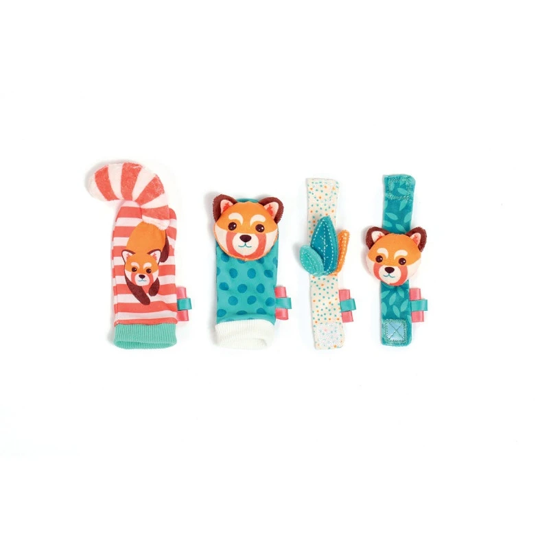 Votre bout de chou sera, sans aucun doute, attirĂ© par le beau renard prĂ©sent sur ces hochets de pieds et mains de LUDI : la tĂȘte de lâanimal sur un bracelet et une chaussette, son corps tout entier avec sa queue en relief sur lâautre chaussette. Le dernier bracelet est quant Ă lui dĂ©corĂ© de curieuses petites feuilles. Il faudra faire preuve de gestes prĂ©cis et maĂźtrisĂ©s pour parvenir Ă attraper tous ces fins dĂ©tails !