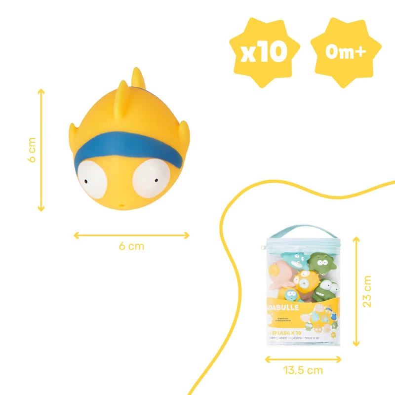Le lot de 10 aspergeurs Splash de Badabulle offre à votre enfant 10 compagnons de bain irrésistibles et drôles ! Les 10 adorables animaux colorés partagent ainsi toutes ses fantaisies dans l’eau : flotter, nager, s’asperger, arroser maman, papa ou ses frères et sœurs…. Pour rendre l’heure de la toilette plus ludique encore !