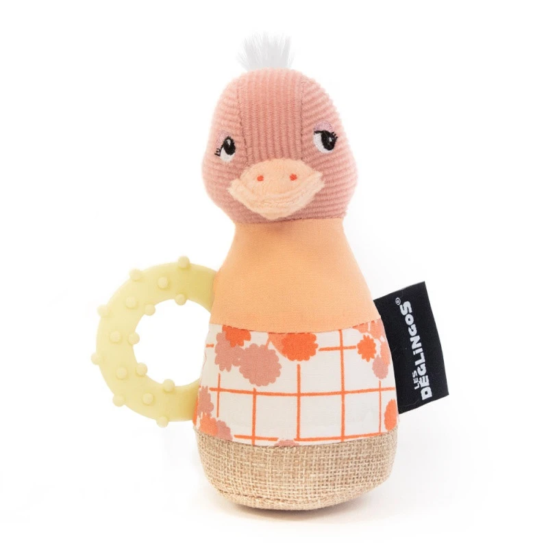 La maraca Pomelos l’autruche Les Déglingos juxtapose en toute harmonie des tissus différents pour varier les sensations sous les doigts et à l’œil : uni ou imprimé, velours côtelé, tissu doux ou toile de jute… chouettos !