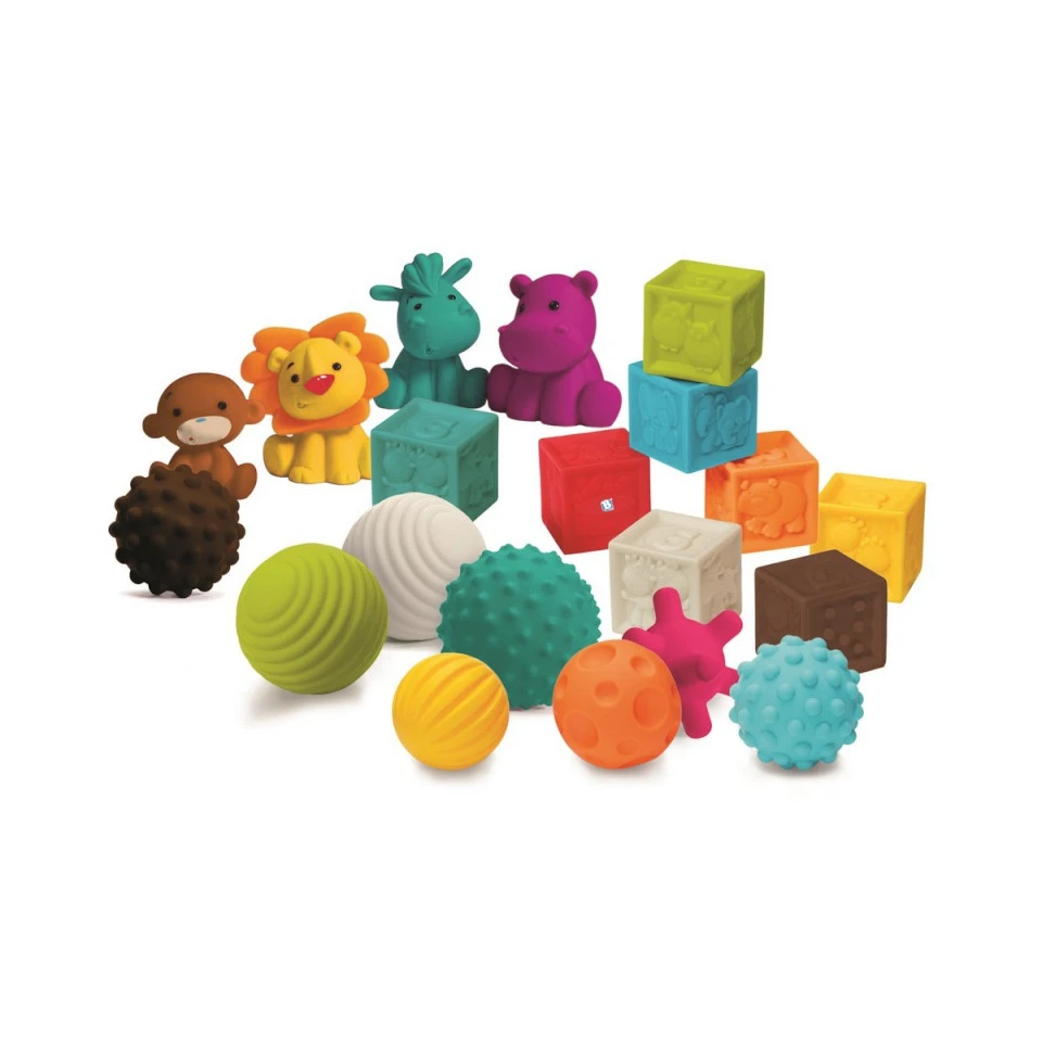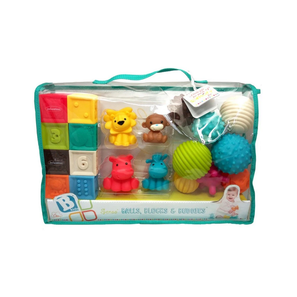 Le super coffret Multi Senso par Infantino est composĂ© de 8 balles, faciles Ă attraper, de textures et de couleurs diffĂ©rentes, idĂ©ales pour le dĂ©veloppement des sens, de 8 cubes colorĂ©s, flexibles et souples pour l’initiation aux couleurs, aux chiffres et aux animaux, ainsi que de 4 animaux: le singe, le tigre, l’hippopotame et le cheval, souples, faciles Ă manipuler et Ă mâchouiller sans risque! Et pour ranger tout cela, un sac transparent muni d’une poignĂ©e pour pouvoir l’emporter partout!
