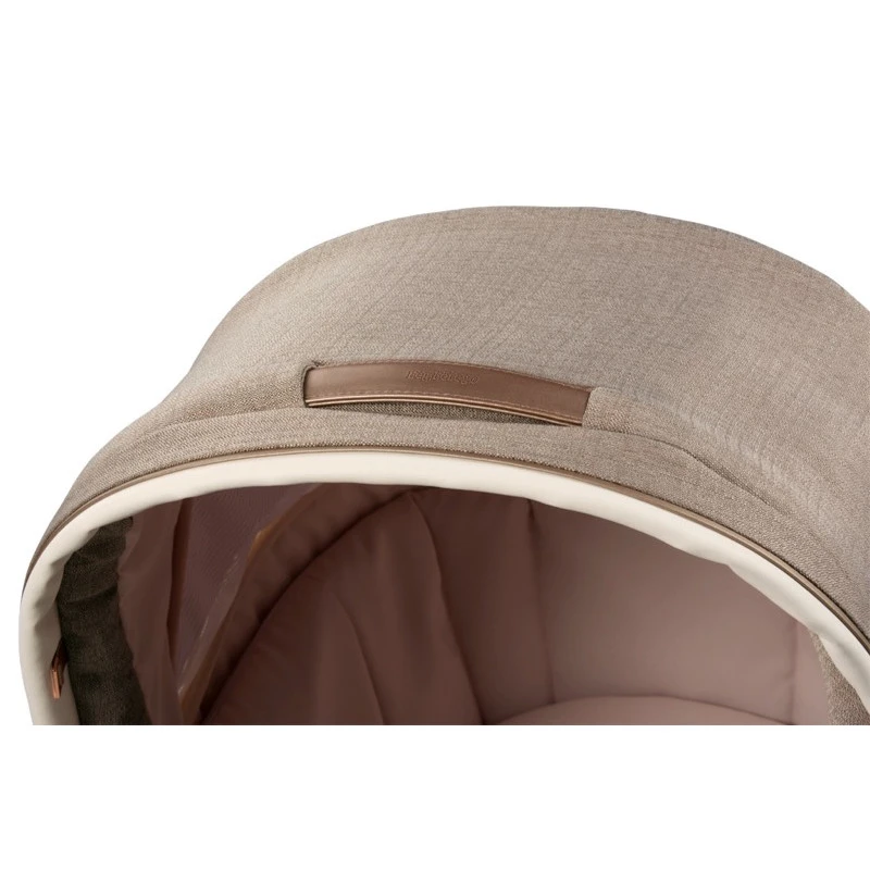 L’élégante anse de transport intégrée en similicuir est brevetée par Peg Perego. Vous pouvez abaisser la capote d’une seule main, même lorsque vous portez votre bébé dans vos bras.