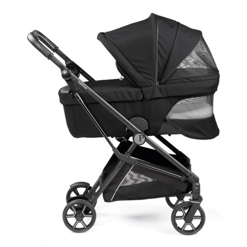 L’élégante anse de transport intégrée en similicuir est brevetée par Peg Perego. Vous pouvez abaisser la capote d’une seule main, même lorsque vous portez votre bébé dans vos bras.