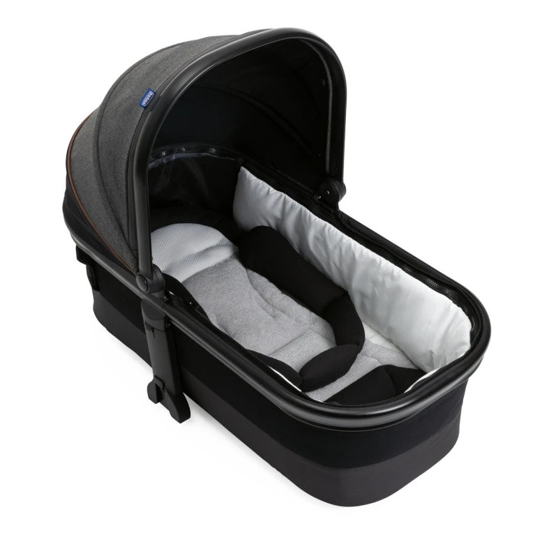 La nacelle Mysa de Chicco s’adapte sur la poussette du même nom en un seul clic pour créer un travel system utilisable dès la naissance.