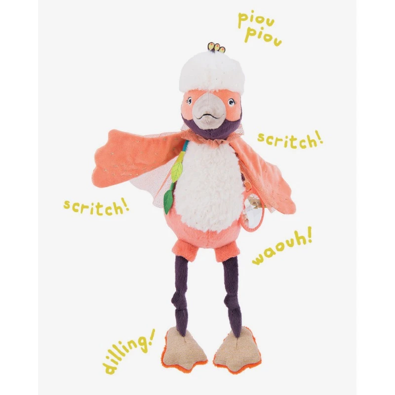 L’oiseau d’activités Paloma Dans la jungle Moulin Roty déborde de fins détails soignés : un col froncé, de fines décorations sur son chapeau, de délicates plumes sous son bras… qui accompagneront le développement moteur de bébé jusque dans ses gestes les plus délicats.