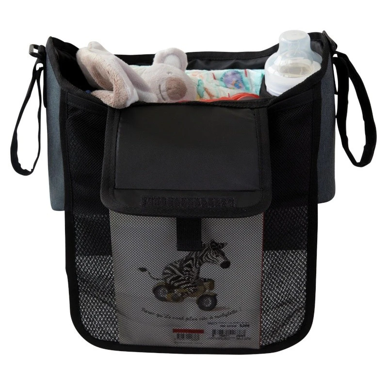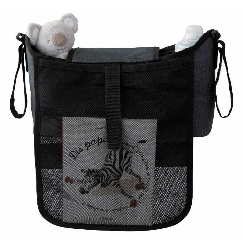 Cet organisateur de poussette est composé de 2 poches avant pour les affaires des parents : téléphone, portefeuille, etc…, de 3 compartiments centraux pour les affaires de bébé tel que couches, lingettes, gouter ou biberon et d’une poche filet au dos pour tout le reste ! Pratique, il est pourvu de fixation universelle avec des attaches auto-agrippante pour s’adapter à toutes les poussettes.
