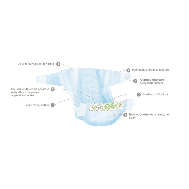 - Barrières anti-fuites : Non-tissé, 100% PP hydrophobe blanc
