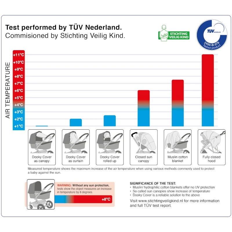 Le pare-soleil universel de Dooky est réalisé en coton Oeko-Tex®, respirant, et il est conçu de façon à laisser l’air circuler ; il est de ce fait beaucoup plus sécurisé et ventilé qu’un textile, même léger comme un lange, que vous positionneriez sur votre poussette, au risque de faire monter la température en dessous. Qui plus est, la protection possède un indice anti-UV UPF50+, ce qui est reconnu comme excellent avec plus de 95 % des UV filtrés.