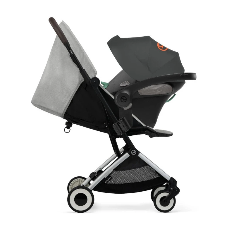 - Soit en complétant la poussette par un siège-auto 1er âge Cybex (coque et adaptateurs vendus séparément).