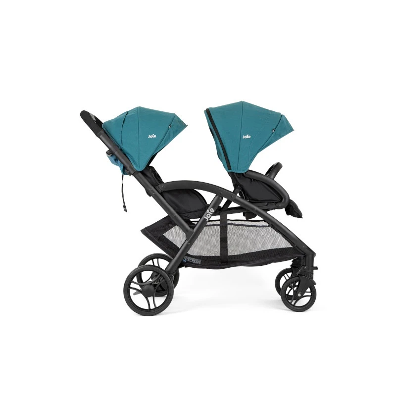 La poussette double Evalite Duo est conçue pour accueillir deux enfants d’âge rapproché. Vous installez le plus petit sur la place arrière, au plus près de vous, soit directement sur l’assise en position allongée, soit sur une coque i-Gemm 3 ou i-Snug 2 de Joie. Dans ce cas, le siège auto s’accroche d’un clic sur la barre de maintien, en toute sécurité (« Sure Lock »). Quant à la place avant de la poussette, inclinable également, elle convient à votre enfant plus âgé dès qu’il tient assis, c’est-à-dire vers 6 mois.