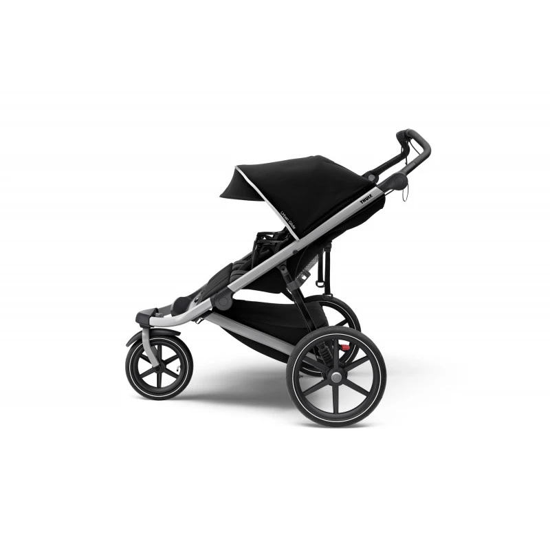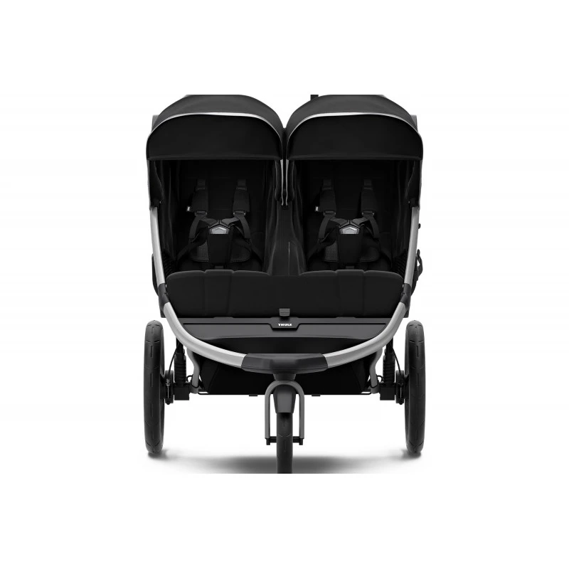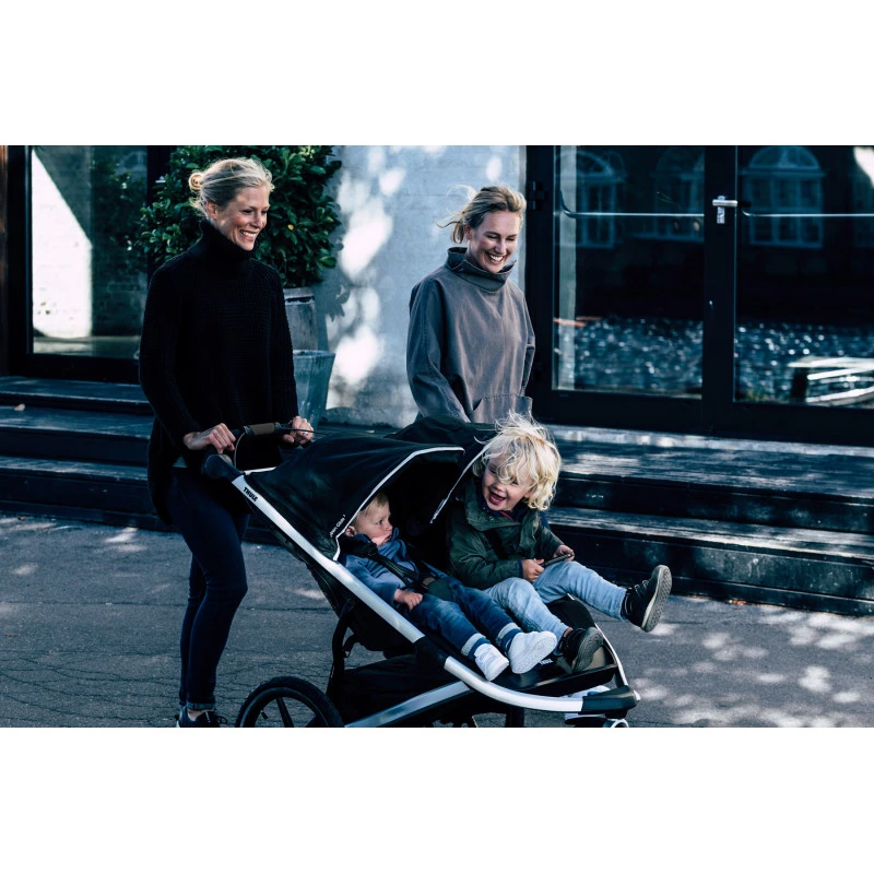 Voici la poussette Urban Glide 2 Double de Thule. Extrêmement maniable grâce à son unique roue avant que vous pouvez verrouiller en position fixe pour faire votre jogging, vous pourrez vadrouiller dans tous les chemins avec ses roues arrières en 16″ ! Pratique, la poussette Urban Glide 2 double est équipée d’un frein à main intégré pour garder le contrôle sur tous les terrains, et ses suspensions rendent les promenades très agréables pour bébé. Ses assise sont sécurisées avec des harnais 5points matelassés et les jantes réfléchissantes de ses roues lui assurent une bonne visibilité aux yeux des autres véhicules.