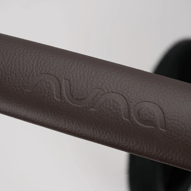 La poussette Mixx next Nuna Riveted mélange harmonieusement une assise et une capote noire et des « cuirs » couleur marron.