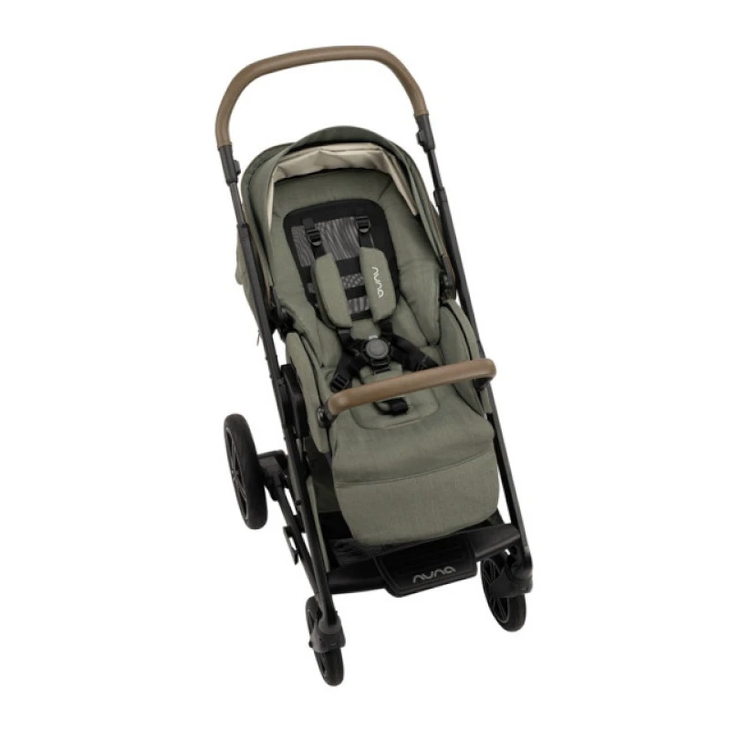 La poussette Mixx next Nuna Mocha mélange harmonieusement une assise grise, une capote mocha et des « cuirs » couleur cognac.