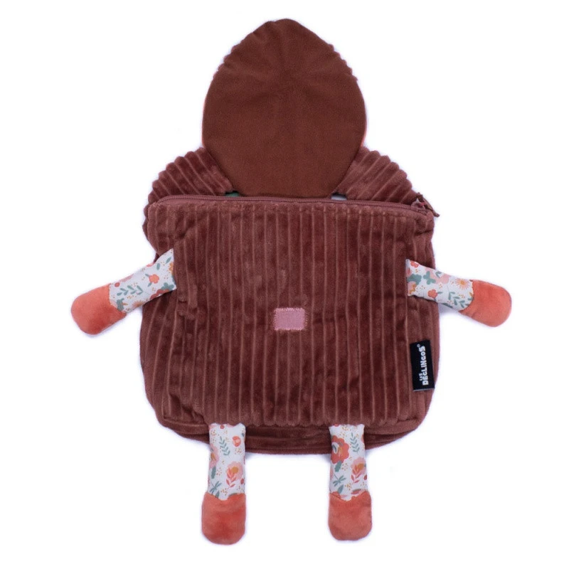 Le sac à dos velours Mélimélos la biche Les Déglingos est hyper mignon ! Il est tout en velours côtelé terracotta, avec sur le rabat, la jolie tête de la biche : ses grands yeux de biche, son nez en forme de cœur et ses fleurs sur la tête, rien ne manque. Sans oublier… deux petites pattos sous le sac et deux autres sur le côté !