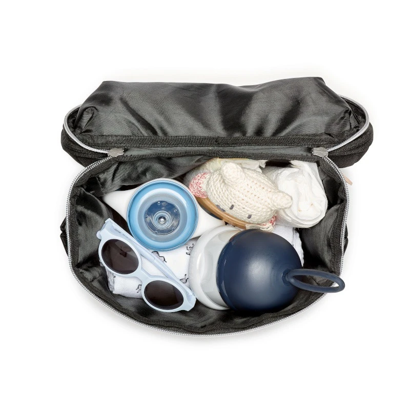 - Grand espace de stockage : vous pouvez y ranger un biberon, une boite doseuse, des collations, des lingettes, un jouet, des couches de rechange.