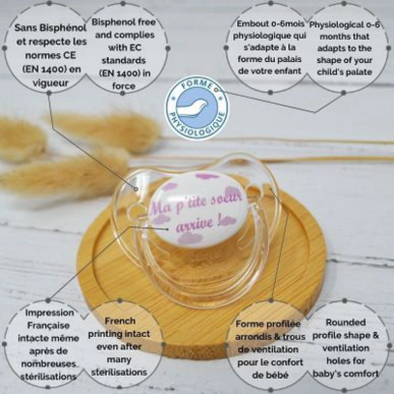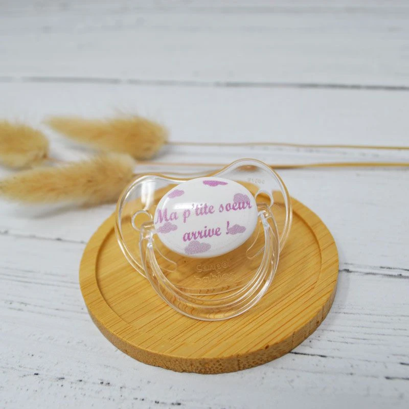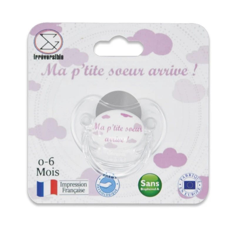 Grâce à cette adorable sucette « Ma p’tite soeur arrive ! » par Irréversible, vous pourrez annoncer votre grossesse à votre entourage avec originalité et humour !