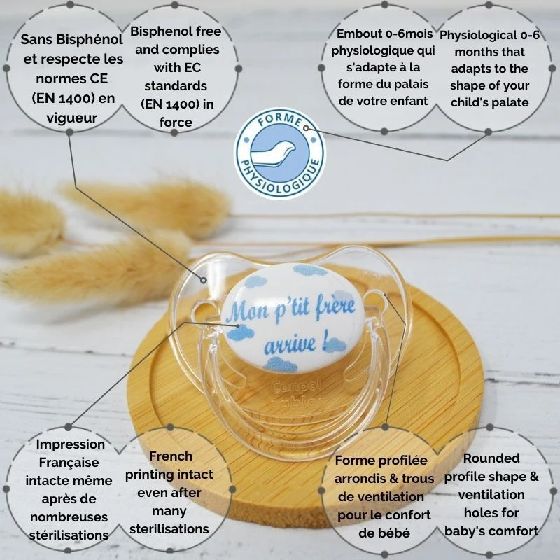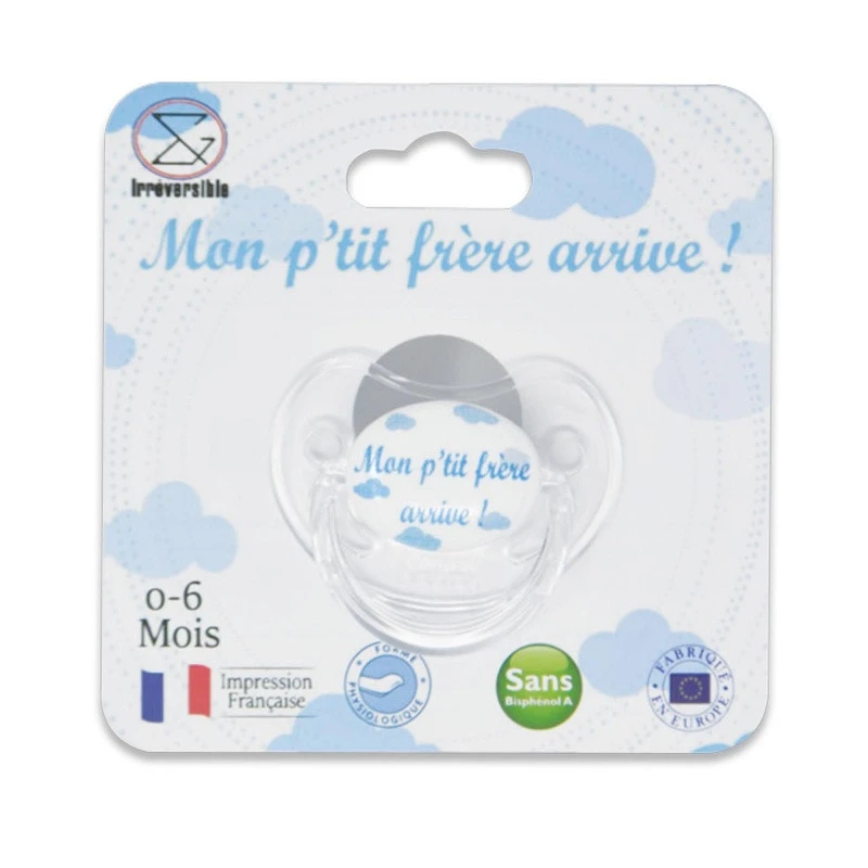 Grâce à cette adorable sucette « Mon p’tit frère arrive ! » par Irréversible Bijoux, vous pourrez annoncer votre grossesse à votre entourage avec originalité et humour !