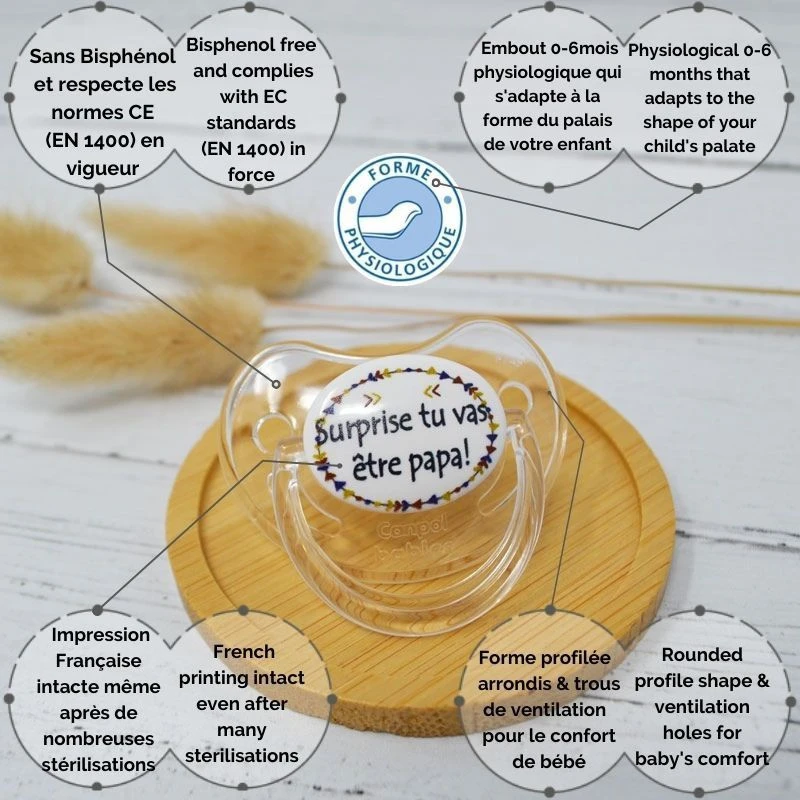 Grâce à cette adorable sucette « Surprise tu vas être papa ! » par Irréversible, vous pourrez annoncer votre grossesse à votre conjoint avec originalité et humour !