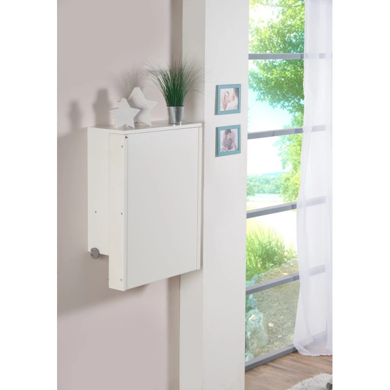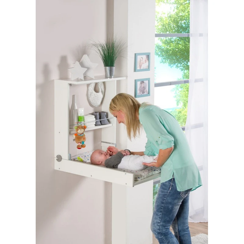La table à langer Wicki par Geuther, au design simple et épuré s’accroche au mur, permettant ainsi de libérer de la place, que ce soit pour une petite salle de bain ou tout simplement pour libérer de la place pour les jeux de bébé. Très pratique elle offre une étagère de rangement, pour avoir le nécessaire à portée de main, tel que les produits de toilettes, les couches ou les vêtements, ainsi qu’un large et confortable espace de change grâce à son matelas à langer inclus. Dotée d’un vérin efficace pour amortir l’ouverture du plan à langer, elle s’ouvre et se ferme d’une seule main, pratique lorsque l’on tient bébé de l’autre !