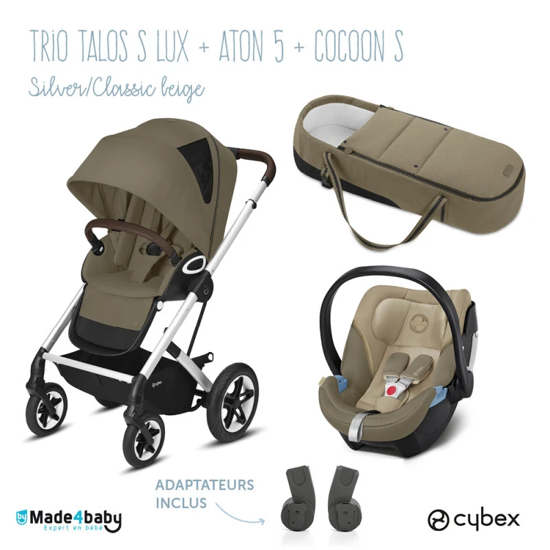 Cet ensemble trio est composé de la poussette Talos S Lux, du siège Aton 5 et de la nacelle Cocoon S de Cybex !